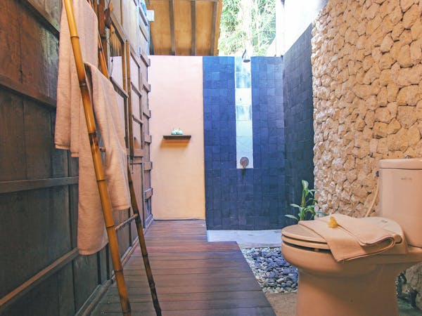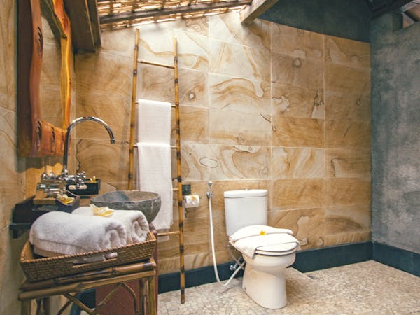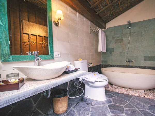 * Kamar mandi en-suite dengan bathtub terazzo dan outdoor shower
