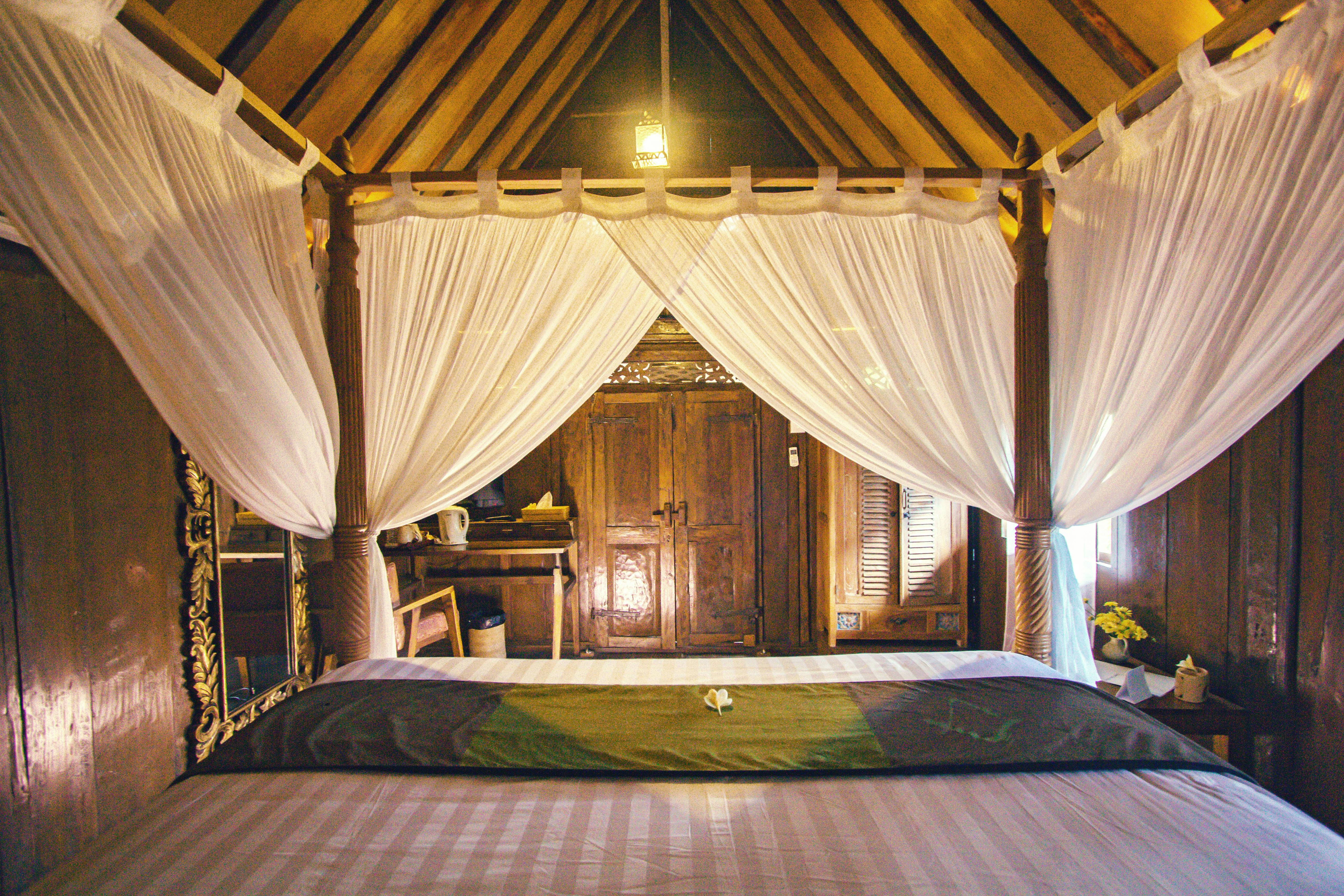 The unique Bawean Tentrem room sits on the second floor of a two-storey wooden house, one of two in Kampung Cenik. The room features an en-suite bathroom with bathtub and a petite lounge area. On the ground floor, it features a daybed platform to unwind.